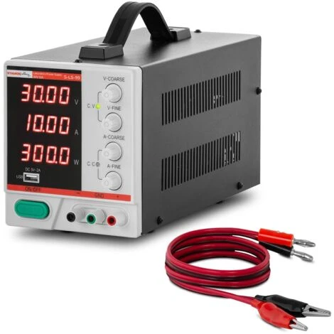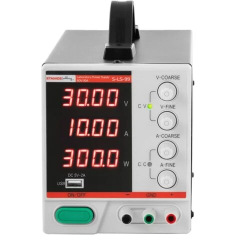 L’alimentation de laboratoire S-LS-99 est spécialement conçue pour approvisionner des appareils externes en courant continu. Elle admet des réglages d’intensité et de tension séparés. Ce modèle se commande au moyen d’une molette et de boutons. La molette permet de sélectionner les paramètres voulus avec exactitude sur une plage 0 à 30 V CC et de 0 à 10 A. Pendant le réglage, un grand écran LED affiche les valeurs pour que vous puissiez les vérifier et les ajuster en fonction de vos besoins.