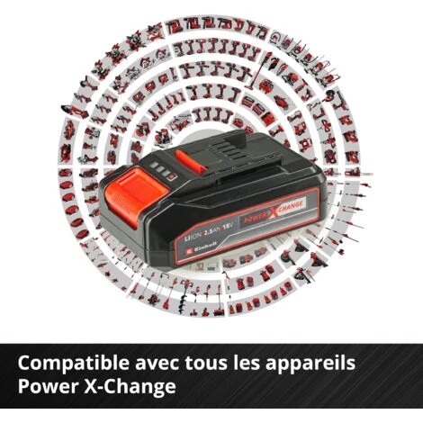 - La batterie Power X-Change 18 V 2,5 Ah est l’élément de base idéal de la gamme Power X-Change, et convient également pour une utilisation en TWIN-PACK pour les outils 36 V.