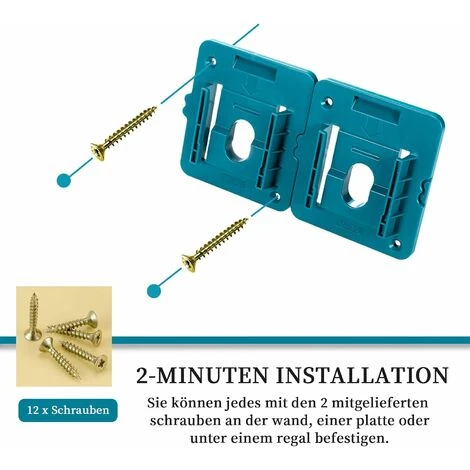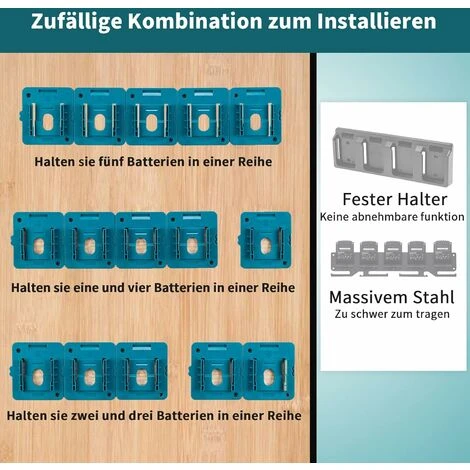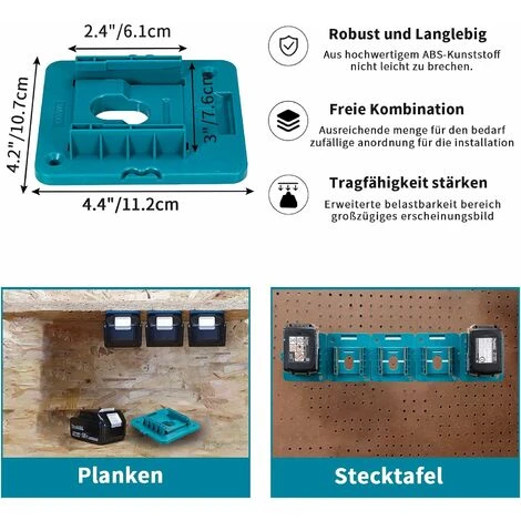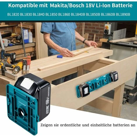 Application – Le support de batterie convient pour toute la série de batteries Makita 18 V à fixer au mur, au garage, à l’atelier, au véhicule de travail, au dessus de la tête.