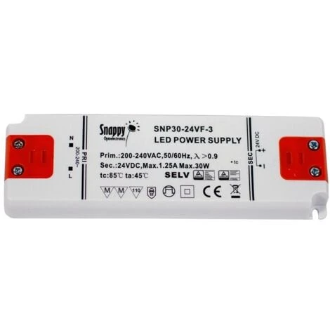 Transformateur 24V 30W 1.25A IP20 ultra fin pour luminaires LED, d’une puissance nominale de 30W. SpĂ©cialement conçu pour alimenter des Ă©clairages LED avec une tension de 24V-DC et 1,25 A maximum.